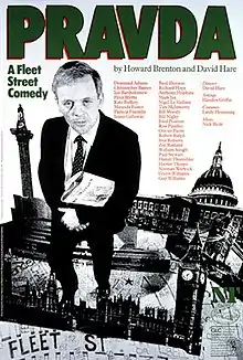 Pravda is a satirical play by David Hare and Howard Brenton exploring the role of journalism in society. It was first produced at the National Theatre in London on 2 May 1985, directed by Hare and starring Anthony Hopkins in the role of Lambert Le Roux, white South African media mogul.[1] Labelled a "Fleet Street comedy", it is a satire on the mid-1980s British newspaper industry during the Thatcher era, in particular the Australian press baron Rupert Murdoch.[2][3][4] Its title refers to the Russian Communist party newspaper Pravda.