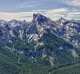 Precipice Peak is a 13,144-foot-elevation (4,006-meter) mountain summit located in Hinsdale County, of Colorado, United States.[3] It is situated 10.5 miles northeast of the community of Ouray, in the Uncompahgre Wilderness, on land managed by Uncompahgre National Forest. It is part of the San Juan Mountains which is a subset of the Rocky Mountains, and is situated west of the Continental Divide. Topographic relief is significant as the west aspect rises 2,500 feet (760 meters) above the West Fork Cimarron River valley in approximately one mile. Neighbors include Dunsinane Mountain three-quarters of a mile north, Courthouse Mountain 2.4 miles northwest, and Redcliff 2.2 miles south. The mountain's name was officially adopted by the United States Board on Geographic Names in 1966.[3] It is so named because of a very prominent precipice on the mountain's east face.[5]