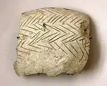 The Hassuna culture is characterized by very distinctive pottery, with motifs painted in red ochre or incised in parallel line networks and/or chevrons. This type of pottery is largely found in northern and central Mesopotamia, as well as in the Khabur region of northeastern Syria.[84]