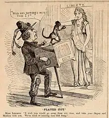 Johnson's Reconstruction policy quickly alienated many in the Republican Party, while Johnson's patronage decisions and alliance with Seward alienated many Democrats.[15] Instead of allying with either of the established parties, Johnson sought to create a new party consisting of the conservative elements of both parties.[16] In August 1866, Johnson held a convention of his supporters in Philadelphia. The convention endorsed Johnson's program, but Johnson was unable to establish a durable coalition.[17] Towards the end of his term, Johnson pursued the 1868 Democratic nomination, but his alliance with Lincoln and his patronage decisions had made him many enemies in that party.[18]