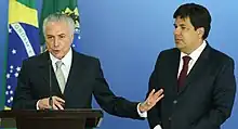 Michel Temer took office twice, the first time as vice-president alongside Dilma Rousseff in 2015, and the second time in 2016 when he took over the government permanently.[2]