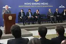 On February 16, 2017, when Temer sanctioned the high school reform law, he declared in his speech at the Planalto Palace that the new model was only possible thanks to the government's boldness in facing up to the controversy surrounding issues that are relevant to the country. According to him, "we have sent proposals that generate healthy controversy. Controversy and criticism therefore generate improvement. Certainly, some of the changes made by Congress were made by society. So we ended up with a consensus. We are daring. Who would dare to put a cap on public spending? It would be very easy for the president to come in and spend as he pleases without worrying about fundamental reforms, in other words, the country's future. We're not doing that. Proposing the cap was a very successful dare. Now, the high school reform." The Minister of Education, Mendonça Filho, added that "high school was static, with thirteen compulsory subjects. [The student] has to assimilate that content in a similar and equal way for everyone, as if each one had the same profile as the other".[7]