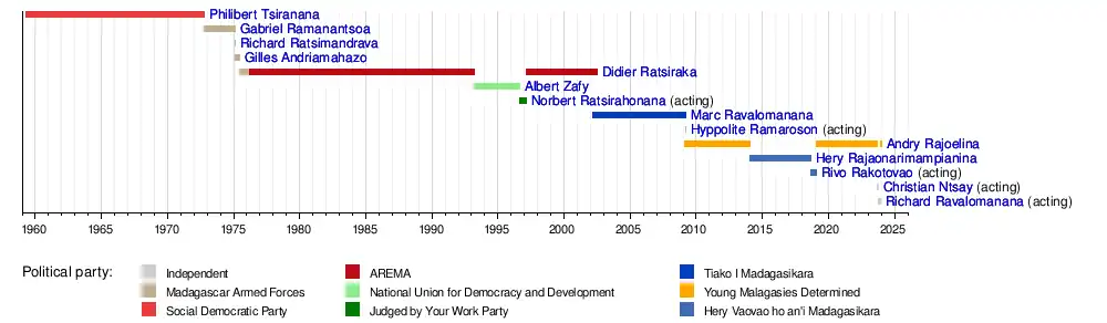 This is a list of presidents of Madagascar, since the establishment of the office of President in 1959, during the Malagasy Republic.