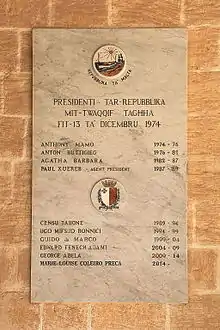 The president of Malta (Maltese: President ta' Malta) is the constitutional head of state of Malta. The president is indirectly elected by the House of Representatives of Malta, which appoints the president for a five-year term and requires them to swear an oath to "preserve, protect and defend" the Constitution.[2] The president of Malta also resides directly or indirectly in all three branches of the state. They are part of Parliament and responsible for the appointment of the judiciary. Executive authority is nominally vested in the president, but is in practice exercised by the prime minister.[3]