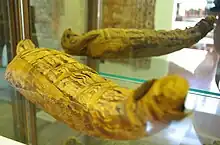 Other items on display include several related to mummification in ancient Egypt. One is a display of alabaster Canopic jars used for storing the internal organs of mummies that are in the shape of a gorilla.[5] Another is a mummy of falcon that dates back to 1500 BC.[5] This includes a casket, with the falcon wrapped up into the shape of Osiris, an Egyptian god.[1][10]