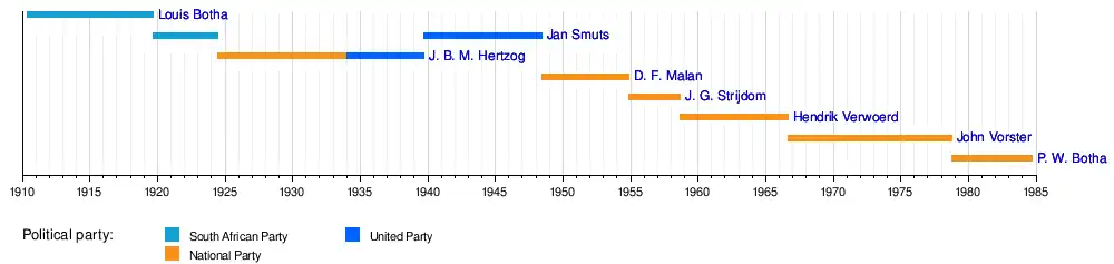 The prime minister of South Africa (Afrikaans: Eerste Minister van Suid-Afrika) was the head of government in South Africa between 1910 and 1984.