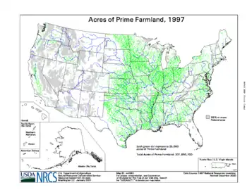 Prime farmland is a designation assigned by U.S. Department of Agriculture defining land that has the best combination of physical and chemical characteristics for producing food, feed, forage, fiber, and oilseed crops and is also available for these land uses.[1]