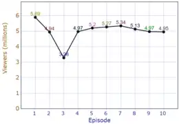 The third series averaged about five million viewers per episode,[20] seen as a successful run[3][20][21] but down from the more than six million of the first and second series.[20] The most viewed episode was the first episode, with 5.89 million viewers, and the least viewed episode was the third episode, with 3.28 million viewers. The series ended with the tenth episode being seen by 4.95 million viewers.[1]