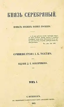Prince Serebrenni (Russian: Князь Серебряный) is a historical novel by Aleksey Konstantinovich Tolstoy, written in 1859-1861 and first published in The Russian Messenger magazine in 1862 (Nos. 8-10, August–October issues) where it was divided into parts I (chapters 1-19, in No. 8) and II (chapters 20-40, Nos. 9 and 10).[1] Translated by Princess Galitzine for Chapmann & Hall, it came out in English in 1874.[2]