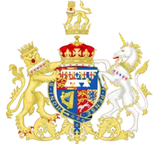 William was granted use of his father's arms (being the arms of the kingdom, differenced by a label argent of five points, the centre bearing a fleur-de-lys azure, the other points each bearing a cross gules), the whole differenced by a label argent (or azure).[32]