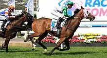 Prince of Penzance is a New Zealand-bred Thoroughbred race horse who won the 2015 Melbourne Cup. He was trained by Darren Weir.[5] In the race, he was ridden by Michelle Payne, who became the first female jockey to win the race.[4][1]