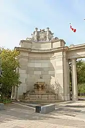 The classically-designed structure includes a single Roman-styled arch made out of cement and stone; with two detached Corinthian columns, flanked on its side by colonnades made of nine Doric columns surmounted by plinths with flags atop them.[6][13] The nine columns in both colonnades represent the nine provinces that existed in Canada at that time.[17][note 1] Curved pylons are placed at the ends of the colonnades, with fountains built at the base of the pylons.[6] The coat of arms of Ontario is placed directly above the fountains on the pylons at the ends of the structure.[18] Imitations of the central sculpture were originally intended to flank to the coat of arms, although these figures were replaced in later designs with ones representing the industries of Ontario.[18] Two miniature Ionic columns that flank the coat of arms were also added to the final design.[18] All together, the structure is approximately 110-metre-long (350 ft).[8]