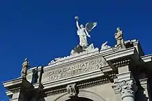 A 7.3 metres (24 ft) statue stands on top of the Roman-styled arches.[8] Referred to as Wing Victory, its design was modified several times during the structure's design phase.[2][17] It has been suggested that the sculpture was modelled after the Winged Victory of Samothrace.[17] However, the design was later modified to showcase the figure raising one arm in the air;[17] holding a laurel in the outstretched arm and a maple leaf in the other.[19] The statue weighs approximately 12 tons.[21] The original central sculpture on the arch was removed as a part of the 1987 restorations, and replaced with a polymer-resin replica in order to forestall potential accidents involving the original deteriorating sculpture.[19][2] Winged Victory stands on a pedestal shaped like a vessel, evoking the metaphor the Ship of State.[18] The outstretched arms of the central sculpture and the structure's colonnades evoking the idea of unified Canada.[18] The central figure is flanked by hippocampuses and two subsidiary male sculptures seated on the gunwales and facing backwards.[18]