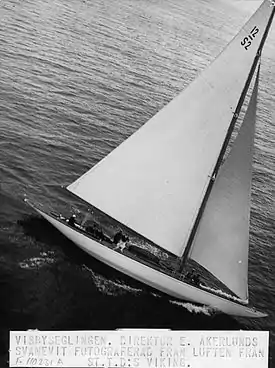 Princess Svanevit was launched in 1930 for Swedish entrepreneur, publisher and publicist Erik Åkerlund.[4] The sloop was designed to be the flag ship at the 100 year anniversary of the Royal Swedish Yacht Club (KSSS). Åkerlund wanted to both attract foreign sailors in the prestigious 12 meter class to the regatta and showcase the best of Swedish boat building crafts for sailors, yacht designers and other experts from all countries. He therefore hired the foremost professionals who could be recruited.[3] At the KSSS regatta where Princess Svanevit won the 12 Metre Class the Swedish royals prince Gustaf Adolf and princess Ingrid (later queen of Denmark] were on board.[1]