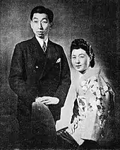 On 4 February 1930, she married Prince Takamatsu at the Tokyo Imperial Palace. The couple had no children. Shortly after the wedding, Prince and Princess Takamatsu embarked upon a world tour, partly to return the courtesies shown to them by King George V of the United Kingdom in sending a mission to Tokyo to present Emperor Shōwa with the Order of the Garter. During their journey, they travelled across the United States so as to strengthen the goodwill and understanding between their nations. The 1930 photo illustration comes from the illustrated biography on Prince Iyesato Tokugawa titled The Art of Peace. The photo presents Princess and Prince Takamatsu during their reception by U.S. President Herbert Hoover.[1][2]