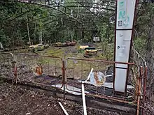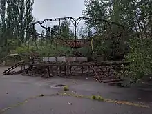 The Pripyat amusement park is an abandoned amusement park located in Pripyat, Ukraine. It was to have its grand opening on 1 May 1986, in time for the May Day celebrations,[1][2] but these plans were cancelled on 26 April, when the Chernobyl disaster occurred a few kilometers away. Several sources report that the park was opened for a short time on 27 April before the announcement to evacuate the city was made.[3][4][5] These reports claim that the park was hurriedly opened to distract Pripyat residents from the unfolding disaster nearby. However, these claims remain largely unsubstantiated and unsupported. Pripyat residents have not been able to recall for sure if the park was opened following the disaster, but considering the lack of panic at the time of the disaster and subsequent evacuation, there would seem to be no need to distract people.[6] In any case, the park—and its ferris wheel in particular—have become a symbol of the Chernobyl disaster.[7]