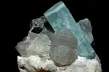 In mineralogy, prismatic is also type of mineral habit (appearance of a crystal). Prismatic minerals have crystals that show a uniform cross-section. Prismatic crystals typically have 3, 4, 6, 8 or 12 faces which are parallel to a crystallographic axis.[2] The apatite group of minerals commonly exhibit elongated hexagonal prisms.[2]