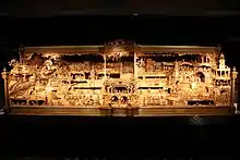 It was built at the turn of the 19th and the 20th century,[9] it took more than forty years to complete. It includes more than 2000 carved parts and figures, which are put in motion by a small electric motor. Altogether, 373 people are depicted.[8] The landscape is divided into seven terraces filled with characters representing both biblical figures and inhabitants of Bohemia.[10] They are carved from linden wood; three of the characters are reported to be made of pear wood.[3] Figures are approximately 10–15 cm high[5] and not polychromed, unlike the figures of most other nativity scenes; the carvers wanted to emphasize the unity of material.[11]