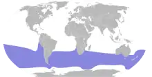 The white-chinned petrel utilises many islands during the breeding season. 2,000,000 pairs breed on South Georgia, Between 175,000 and 226,000 pairs are on the Kerguelen Islands, and 100,000 pairs on Disappointment Island. Some also breed on the Crozet Islands, Prince Edward Islands, Campbell Islands, Auckland Islands, Antipodes Islands, and the Falkland Islands. During the non-breeding season, the petrels fly from the Antarctic pack ice to the subtropics.[10]