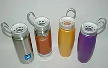 The Half Twist bottle was introduced in 2010 in an effort to expand the scope of Product Architects’ hydration options beyond the sports bottle market.[6] The primary feature of the bottle is the Half Twist cap, which is fitted with a silicone gasket. The lid allows the user to drink directly from the cap without removing it from the bottle and the gasket creates a watertight seal when closed. The Half Twist received positive reviews,[7][8] though some users found the lid difficult to operate. The lid comes on two types of bottles: a 24-ounce (710 ml) High-density polyethylene bottle and a 28-ounce (828 ml) Stainless steel bottle. Both bottle types are BPA- and Phthalate-free.