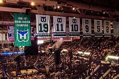 Years after the departure of the Whalers, the team remains a focus of civic pride among Connecticut residents. The retired jersey numbers still hang on green and white banner from the rafters of the former Hartford Civic Center (now called the XL Center) where the team played in Hartford.[3] Aside from the jersey numbers officially retired by the team, the banners include former team members Ulf Samuelsson (#5), Gordie Howe (#9), Ron Francis (#10), and Kevin Dineen (#11), which were symbolically added by Hartford Wolf Pack management in honor of the players in 2006, nine years after the team departure.[4]