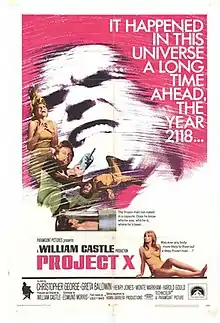 Project X is a 1968 independently made color science fiction film, produced and directed by William Castle, starring Christopher George, Greta Baldwin, Henry Jones, and Monte Markham. The film was distributed by Paramount Pictures and is adapted from the science fiction novels The Artificial Man (1965) and Psychogeist (1966) by L. P. Davies. The script was written by Edmund Morris and had special sequences animated by Hanna-Barbera.
