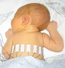 A newborn baby placed in prone position with electrical impedance tomography electrodes to assess the effect on lung ventilation