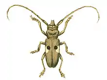 General colour brownish grey. Head deep and grey; one of the sexes having a remarkable thick and strong tubercle issuing from the middle of the face, terminating in two black acute angles, like horns. Mouth armed with two strong black jaws, and four grey palpi. Antennae grey, and longer than the insect. Thorax grey, the sides terminating in a thick spine; having a broad, white streak crossing it on each side, and extending along the abdomen, beyond the middle legs, narrowing to its extremity. Scutellum small and triangular. Elytra grey and margined, having two round black spots on each, the largest placed about the middle near the suture; the other (a small one) is on this side joined to the margin. A cream-coloured spot is situated just below the former, which extends from thence to the lateral margin. Legs grey, without any spines or marks. Body length 1¼ inches (32 mm).[2]