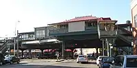 The city government took over the IRT's operations on June 12, 1940.[12][13] The Bergen Avenue cutoff, which allowed Third Avenue trains to access the White Plains Road Line, was abandoned on November 5, 1946, as part of the gradual curtailment of elevated service on the IRT Third Avenue Line.[6] On June 13, 1949, the platform extensions at this station, as well as those on White Plains Road Line stations between Jackson Avenue and 177th Street, opened. The platforms were lengthened to 514 feet (157 m) to allow full ten-car express trains to open their doors. Previously the stations could only accommodate six-car local trains.[14]