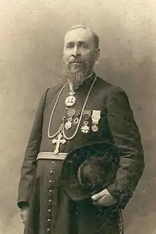 Augouard is known for exploring the Congo and Ubangi Rivers, for which he was awarded a prize from the Paris Geographical Society.[4] Augouard settled in Brazzaville in 1887. In 1890 he was appointed Bishop of Brazzaville and vicar apostolic of the Upper Congo and Oubangui.[5] In the process of exploration he developed Christian mission stations along some 1,300 miles (2,100 km) of the Congo River.[3] Because of his rapid expansion of missions he was nicknamed Diata-Diata, meaning 'quick-quick'.[3] He was also given the nickname Cannibal Bishop, because many of his Christian followers were former cannibals.[3]