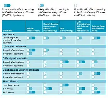 In a 2006 study looking at patients' quality of life, LDR brachytherapy compared favourably with other treatment options.[18] Table 1 summarises the more common side-effects related with each form of treatment and how these may affect patient recovery.