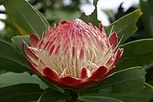 Protea caffra (sometimes called the common protea), native to South Africa, is a small tree or shrub which occurs in open or wooded grassland, usually on rocky ridges. Its leaves are leathery and hairless. The flower head is solitary or in clusters of 3 or 4 with the involucral bracts a pale red, pink or cream colour. The fruit is a densely hairy nut. The species is highly variable and has several subspecies.