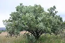Upright shrub to small tree 3 – 8m in height with a definite main stem up to 400mm in diameter, crown uneven and spreading. Bark black to dark brown with net-like fissures when mature. Leaves linear-elliptic to linear-falcate, narrow to broadly elliptic, narrow to broadly invert lanceolate, occasionally falcate; 70 – 250mm in length, 4 – 45mm wide, tips blunt to acuminate; smooth, leathery to thin and papery, light green to glaucous green, have a tendency to clump in each year's growth. Flowers carried at the end of leafy twigs 4 – 12mm in diameter, usually singly but up to 4 heads may be grouped at the tip; globose to egg-shaped, broad and shallow when fully open, 45 – 80mm in diameter, base broad convex to flat, 20 – 30mm in diameter. Involucral bracts in 6 – 8 series; outer series broad oval to deltoid, 10 – 20mm wide, 5 – 7mm long, usually with silky silvery pelt of varying thickness at the distal ends but may be hairless, closely and densely shingled; inner series elongated to broadly elongated spatulate, 30 – 50mm long, 10 – 20mm wide, tips rounded to almost acuminate, slightly concave, smooth, varying in color from pale cream to brick red; very variable.