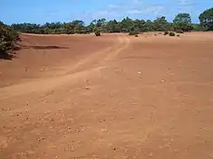The Barreiro is situated at an altitude of 210 metres (690 ft) and includes a hummocky surface, with gentle slopes of 4-5% incline and a limited drainage capability.[2] The areas with limited or lacking vegetation are susceptible to erosion, resulting in the formation of dunes caused by surface runoff or wind-based erosion.[2] These conditions have resulted in a landscape that is completely unique to Santa Maria and the archipelago, resulting in its nickname, the Red Desert of the Azores.[2]