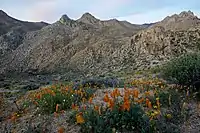 Tulare County | 1994[23] | 13,140 acres (20.53 sq mi; 53.2 km2) | 5,200–7,994 ft (1,600–2,437 m)[22] | The Chimney Peak Wilderness protects an area of transitional high desert in the foothills of the southeastern part of the range. Vegetated with sagebrush at lower elevations and pinyon-juniper woodland at higher elevations, the wilderness area is known for its displays of wildflowers in wet years. A number of streams and springs counterbalance the otherwise dry and rocky nature of the landscape. |