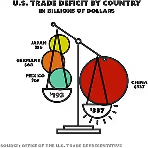 Opinions on trade and protectionism have fluctuated since the early 2000s. Opinions recently have decided roughly of partisan lines. In 2017, while 67% of Democrats believe free trade agreements are good for the United States, only 36% of Republicans agree.[82] When asked if free trade has helped respondents specifically, the approval numbers for Democrats drop to 54%, however approval ratings among Republicans remain relatively unchanged at 34%.[82] The 2016 election marked the beginning of the trend of returning to protectionism, an ideology incorporated into Donald Trump's platform. During the Republican primary, Trump voters had a much more positive view of protectionism and "economic nationalism" than Cruz or Kasich voters.[83] However, after the election there seems to have been a push-back against such sentiments, with an uptick in support for free trade agreements in both parties,[82] with 72% of respondents saying international trade was an opportunity, not a threat.[84] Scholars, such as Michael J. Hiscox, have argued that public opinion of international trade and protectionism is particularly malleable to political framing because of the complexity of the issue. Due to this complexity, the public is more likely to look to the elites in their own political parties to form their opinions.[85]