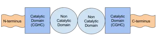 Protein disulfide-isomerase has two catalytic thioredoxin-like domains (active sites), each containing the canonical CGHC motif, and two non catalytic domains.[4][5][6] This structure is similar to the structure of enzymes responsible for oxidative folding in the intermembrane space of the mitochondria; an example of this is mitochondrial IMS import and assembly (Mia40), which has 2 catalytic domains that contain a CX9C, which is similar to the CGHC domain of PDI.[7] Bacterial DsbA, responsible for oxidative folding, also has a thioredoxin CXXC domain.[8]