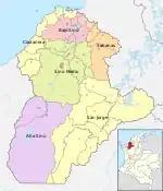 Colombia is divided into 32 departments. These in turn are divided into municipalities, though some receive the special category of district. However, there are also provinces, a generic name applied to provinces, districts, regions and subregions. These are generally internal administrative authorities of the departments, more historical than legal. Most Colombian departments have this kind of subdivision. Those that do not are the departments of Amazonas, Arauca, Caquetá, Casanare, Guainía, Guaviare, Putumayo, San Andrés y Providencia, Vaupés, and Vichada.