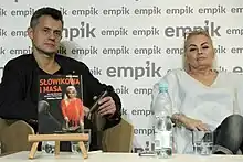 Artur Górski, a crime journalist, and Monika Banasiak, the wife of one of the leaders of the mafia, presenting Górski's book on the organization, 2017