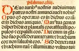 Psalm 44 is the 44th psalm of the Book of Psalms, beginning in English in the King James Version: "We have heard with our ears, O God, our fathers have told us". In the slightly different numbering system used in the Greek Septuagint version of the bible, and generally in its Latin translations, this psalm is Psalm 43. In the Vulgate, it begins "Deus auribus nostris audivimus patres nostri adnuntiaverunt".[1] The psalm was composed by the sons of Korah and is classified in the series of lamentations of the people.