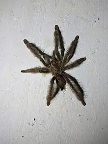 Psalmopoeus pulcher is a species of tarantula with long hairs that is predominantly gray with a slight hint of a pale yellow or beige color. This species' bite leads to pain, but does not seem to have a venomous effect.[2]