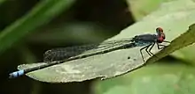 A medium-sized damselfly (length 32–41 mm; wingspan 42–48 mm).[2] The face is brick red and the front of the eyes are cherry-red; the back of the eyes are black above and green below; it has mauvish reddish brown post-ocular spots that are joined by a stripe of the same colour. The synthorax is mauvish brown (ageing to purplish brown) with black stripes above; the sides are light blue. The abdomen is black above and green below; segments eight and nine are bright blue with narrow black rings at their ends and segment ten is black above with bright blue sides.[3] Cerci are longer than paraprocts, which are hatchet shaped with a dorsal knob.[4]