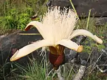 The large and rigid structure of the tree's flowers, combined with the flower's placement on the ends of branches and the chamber for nectar favors pollination by medium-sized mammals such as Caluromys as well as various bats. The plant is predominantly pollinated by bats, but the species Caluromys lanatus frequents the tree in its native habitat as the placement and infrequency of flowers favors the movement of marsupials from one tree to another.[2]