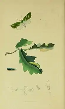 Forewing yellow green; costal edge pink, diffused towards apex; inner marginal area pink-suffused, except towards base; inner and outer lines oblique, darker green, conversely edged with white, the outer sometimes pink; subterminal line white, curved into apex: fringe pink with a white line at base; hindwing yellow; fringe pale pink, white at tips from apex to vein 2: abdomen white, dorsally suffused with yellow; in the female the abdomen is white, tinged with brown at base: forewing with costal edge white, and inner margin yellow; hindwing white. In the British form, subspecies P. p. britannica subsp. nov. (53 k), all the three lines are silvery white; the costal and inner margins in the male reddish only at apex and tornus respectively; in the ab. P. p. rufilinea ab. nov. (= ab. 2 Hmps.) (53 k) the outer line is marked with red. Larva apple green coarsely shagreened with yellow; the subdorsal line yellow; segment 2 red rimmed in front.[1] The wingspan is 30–35 mm.