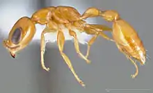 Workers are yellow, orange, or brown. They are slender with large eyes, short antennal scapes and a well-developed sting.[1][2] Head widths measure 0.68–0.89 millimeters. The surface of the head is shiny, due to the lack of a fine hairy covering. Workers of P. pallidus are monomorphic.[1][3]