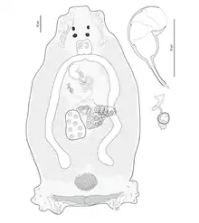 Pseudorhabdosynochus maternus is a small monogenean, 0.6 mm in length. The species has the general characteristics of other species of Pseudorhabdosynochus, with a flat body and a posterior haptor, which is the organ by which the monogenean attaches itself to the gill of is host. The haptor bears two squamodiscs, one ventral and one dorsal. The sclerotized male copulatory organ, or "quadriloculate organ", has the shape of a bean with four internal chambers, as in other species of Pseudorhabdosynochus.[2] The vagina includes a sclerotized part, which is a complex structure. In this species, the sclerotised vagina has a big spherical primary chamber and a small spherical secondary chamber.