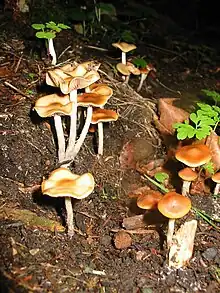 Psilocybe cyanescens, commonly known as the wavy cap or potent psilocybe,[1] is a species of potent psychedelic mushroom. The main compounds responsible for its psychedelic effects are psilocybin and psilocin. It belongs to the family Hymenogastraceae. A formal description of the species was published by Elsie Wakefield in 1946 in the Transactions of the British Mycological Society, based on a specimen she had recently collected at Kew Gardens.[2] She had begun collecting the species as early as 1910.[3][4] The mushroom is not generally regarded as being physically dangerous to adults.[5][6] Since all the psychoactive compounds in P. cyanescens are water-soluble, the fruiting bodies can be rendered non-psychoactive through parboiling, allowing their culinary use. However, since most people find them overly bitter and they are too small to have great nutritive value, this is not frequently done.[5]