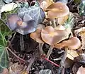 Psilocybe cyanescens has a hygrophanous pileus (cap) that is caramel to chestnut-brown when moist, fading to pale buff or slightly yellowish when dried. Caps generally measure from 1.5–5 cm (½" to 2") across, and are normally distinctly wavy in maturity.[1] The color of the pileus is rarely seen in mushrooms outside of the P. cyanescens species complex. Most parts of the mushroom, including the cap and Lamellae (gills, underneath the cap) can stain blue when touched or otherwise disturbed, probably due to the oxidation of psilocin.[6][8] The lamellae are adnate, and light brown to dark purple brown in maturity, with lighter gill edges. There is no distinct annulus, but immature P. cyanescens specimens do have a cobwebby veil which may leave an annular zone in maturity.[1] Both the odor and taste are farinaceous.