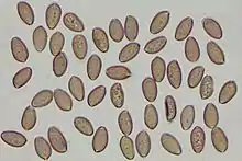P. cyanescens has elliptical spores which measure 9–12 x 5–8 µm.[9] According to some authors, the holotype collection of the species from Kew Gardens featured no pleurocystidia, but North American collections are characterized by common clavate-mucronate pleurocystidia.[5][6] However, pleurocystidia are present in the holotype collection (but not easily to observe since hymenium is collapsed). In European collections of P. cyanescens, pleurocystidia are common and their shape is identical to those known from the United States.[2][10] In 2012, an epitype from Hamburg, Germany was designated.[11]