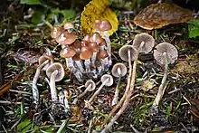 - ↑ Depending on the authority consulted, the taxon Psathyra is considered either a subgenus of Psathyrella,[1] or synonymous with Psathyrella.[2]